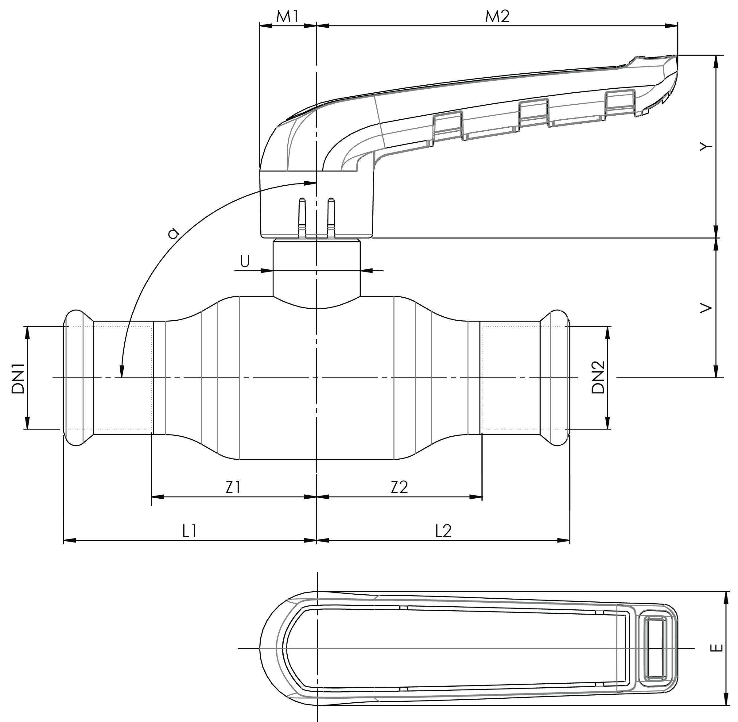 • Uitwendige buisdiameter aansluiting 1: 22 mm