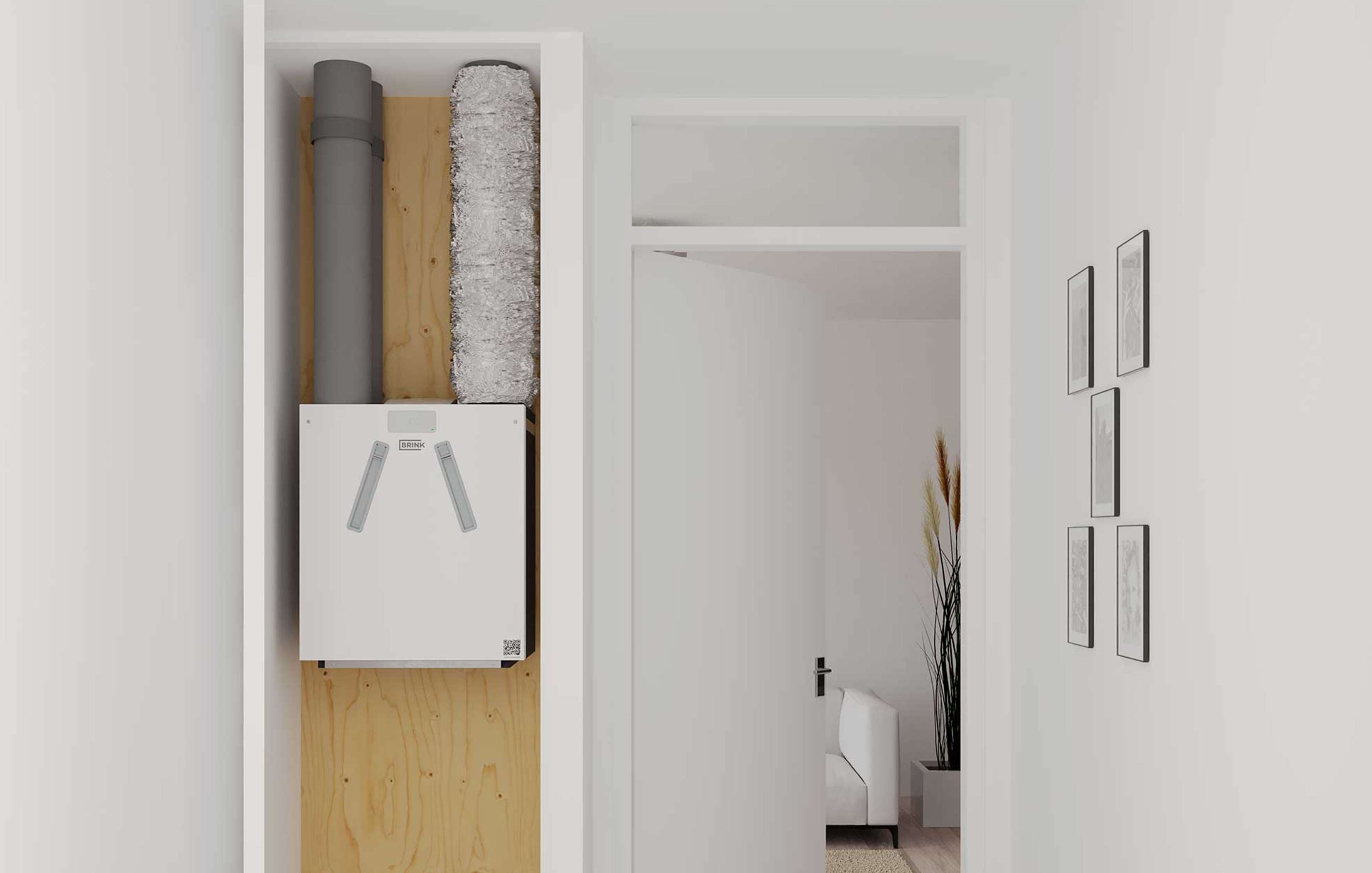 Met afmetingen van slechts 31,5 cm diep en 56 cm breed, past het toestel in de kleinste ruimtes, zoals een berging of zelfs een (gang)kast. Je kan kiezen uit vier varianten, zodat er altijd een passend toestel is voor elk project: een linker en een rechteruitvoering en beide mogelijk met een enthalpiewisselaar. En standaard voorzien van een geïntegreerde bypass voor een hoog comfort in de zomer.