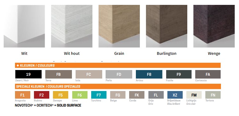 Materiaal Novotech (Solid Surface)Kleur binnenkant wit mat, kleur buitenzijde vlgs omschrijving