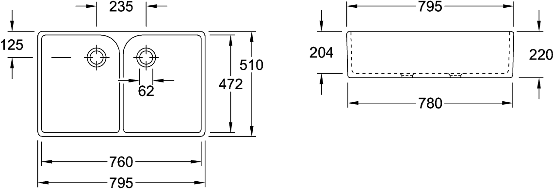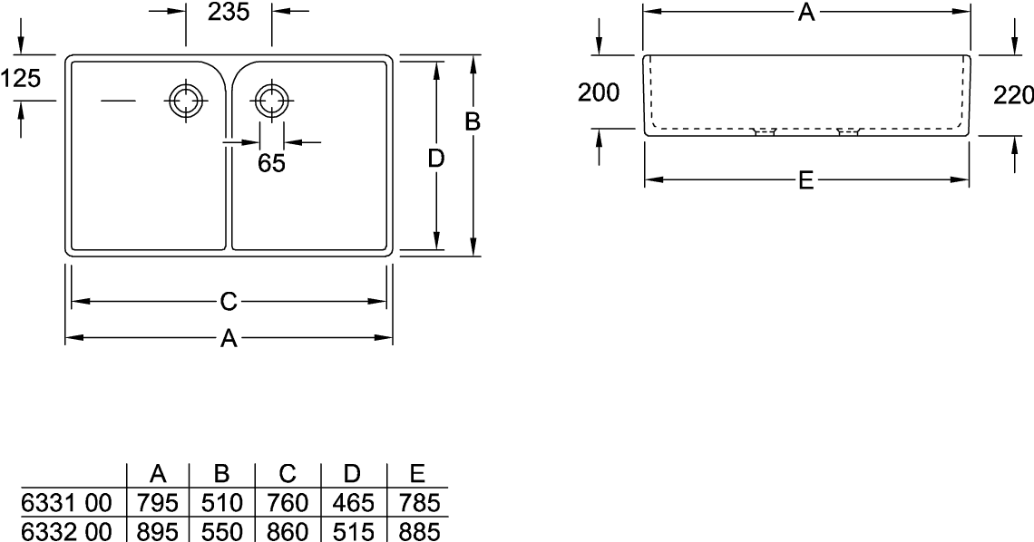 Spoelbak dubbel O.novo 795x220x510mm 633100R1 Villeroy & Boch